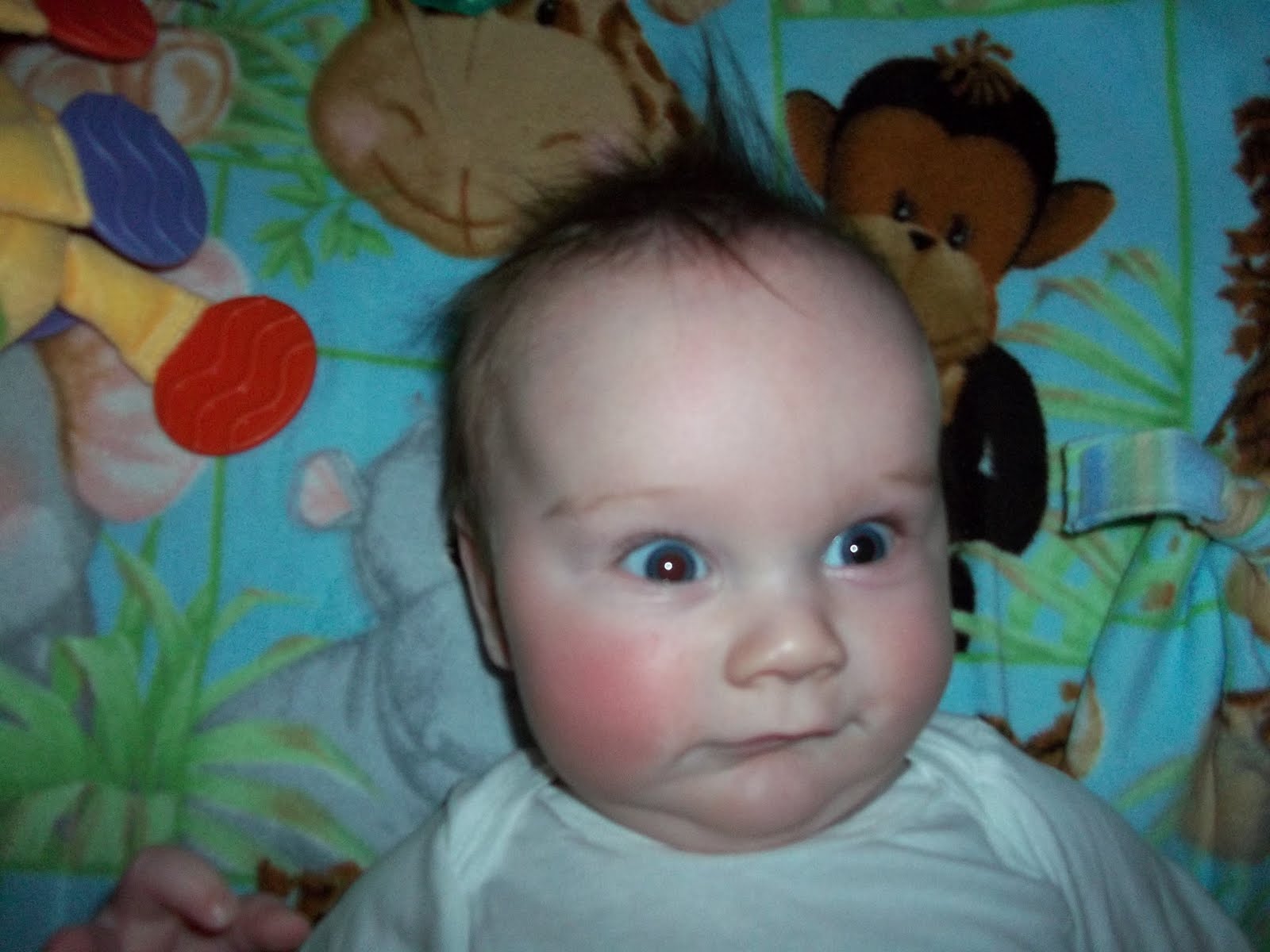 Elijah has just started to reach out his arms when he wants to be picked up. He has also started making new, higher pitched sounds. The heavy drooling that started about 2 months ago still comes and goes. I have been checking for teeth every so often, but I don't see any sign of them poking through yet.